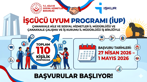 Çanakkale Çalışma ve İş Kurumu İl Müdürlüğü ile Çanakkale Aile ve Sosyal Hizmetler İl Müdürlüğü iş birliğinde, toplam 110 kişilik İşgücü Uyum Programı (İUP) hayata geçiriliyor. Program kapsamında farklı ilçelerde görevlendirilmek üzere katılımcılar alınacak.
