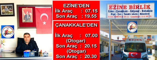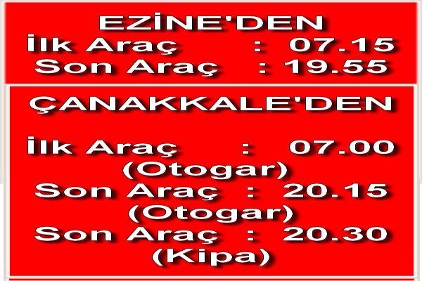 Çırkan yaptığı açıklamada, Ezine’den ilk seferin sabah saat 07.25’te başlayıp akşam 19.55’e kadar. Çanakkale’den de ilk seferin 07.00’de Otogardan başlayıp akşam en son 20.15 Otogar, 20.30’da ise Kipa durağından olmak üzere her yarım saatte bir devam edeceğini belirtti.