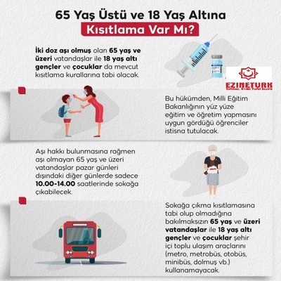 1.6- Aşı hakkını kullanarak iki doz aşı olmuş olan 65 yaş ve üzeri vatandaşlarımız ile 18 yaş altı gençler ve çocuklarımızla ilgili olarak, herkes için uygulanan sokağa çıkma kısıtlamasının dışında ayrıca bir sokağa çıkma kısıtlamasının uygulanmamasına,